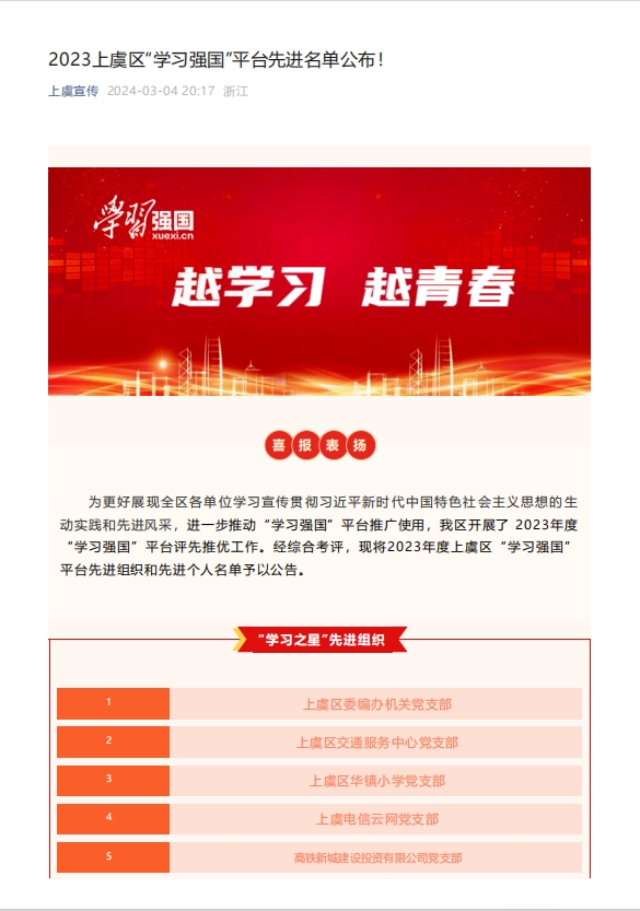 日前,上虞區委宣傳部公告2023年度上虞區“學習強國”平臺先進組織和先進個人名單,我公司黨員應國榮成功勝出,名列其中,被評為2023年度“學習之星”先進個人。
