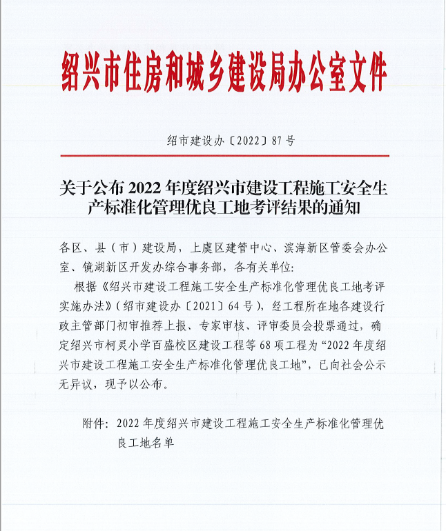 近日,經工程所在地各建設行政主管部門現場復核、初評推薦上報、專家審核、評審委員會評定,由紹興市住房和...
