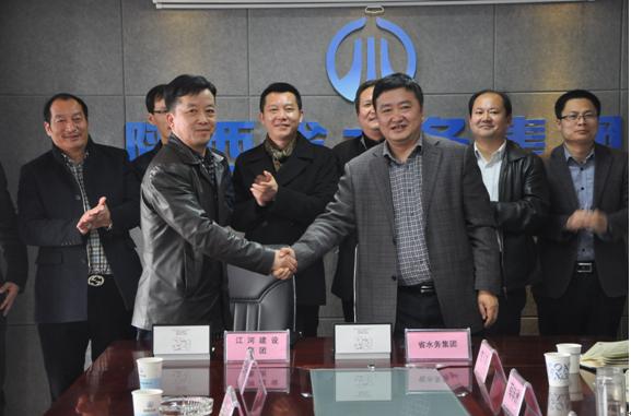 2015年3月6日下午,江河建設集團有限公司與陜西省水務集團有限公司在陜西省水務集團供水公司會議室舉行了戰略合作簽字儀式。江河集團董事長、總經理袁偉忠,副總經理李京利,陜西分公司經理張軍等代表,以及陜西省水務集團執行董事、總經理王瑜及其領導班子共十二人出席了此次簽字儀式。