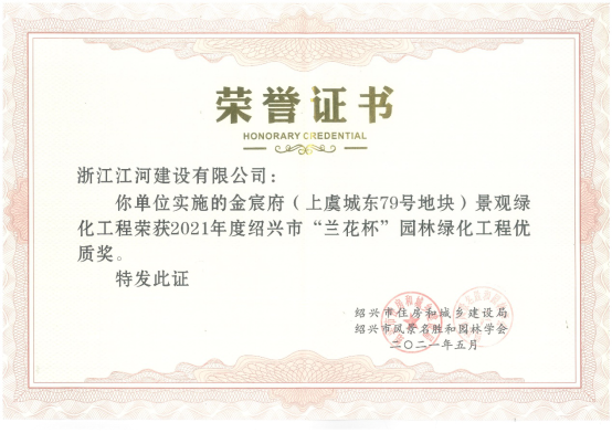 由我司承建的金宸府(上虞城東79號地塊)景觀綠化工程,經紹興市住房和城鄉建設局、紹興市風景名勝和園林學會評審后,憑借獨特的設計和精湛的工藝,榮獲2021年度紹興市“蘭花杯”園林綠化工程優質獎。