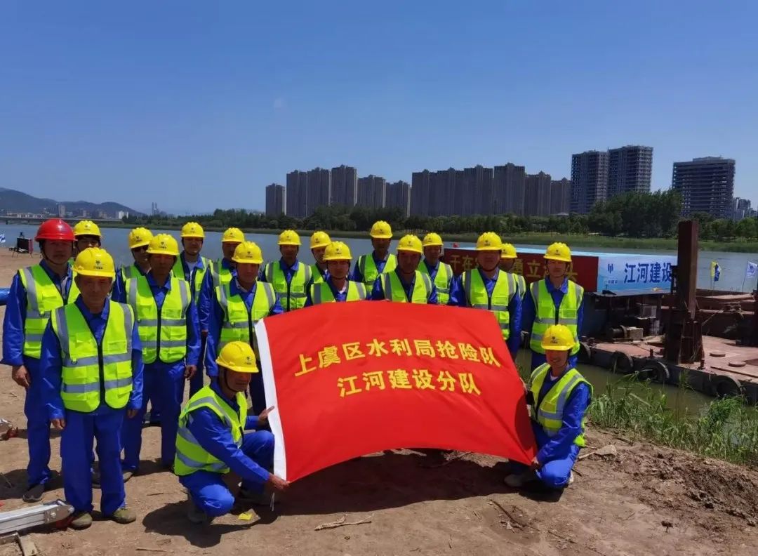 我司作為本次演練活動的協辦單位,不僅完成了前期演練場地平整工作,在演練中還負責實施了堤防險情應急處置科目中的船拋石籠防沖、插打板樁圍堰進行堤腳加固二個子科目。我司搶險隊員工20人作為上虞區水利局搶險隊代表參加了列隊演練。