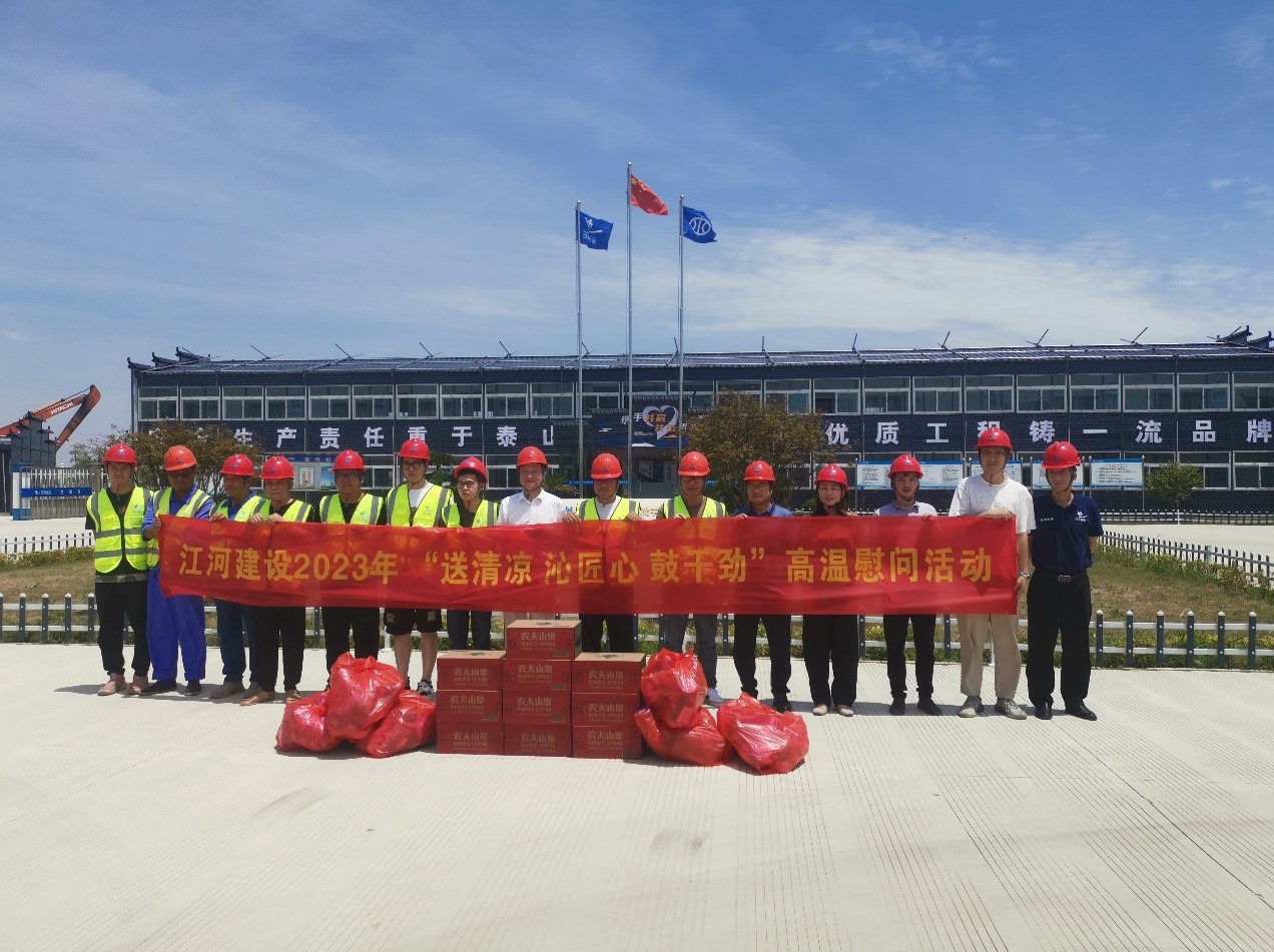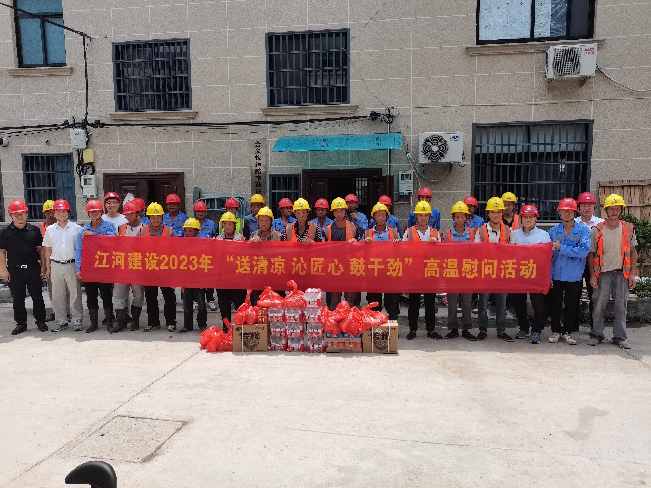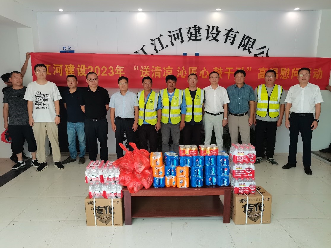 “夏送清涼,關懷暖心”。時值盛夏酷暑,江河建設公司各重點在建工程項目正在有序推進,一線的職工們備受“烤”驗。為有效改善職工生產生活條件,認真做好高溫天氣職工勞動保護工作,連日來,浙江江河建設有限公司工會組織開展“送清涼,沁匠心,鼓干勁”為主題的高溫慰問活動,成立由工管、工會、人力、安全等負責人組成的“紅+安全”慰問組,帶著公司董事長袁偉忠、總裁陳宋江的關懷問候和委托,深入全國各地的項目施工現場,慰問奮戰在高溫一線的工人,為其送去礦泉水、毛巾、風油精、飲料、藿香正氣水等防暑降溫等物資,并為他們對公司高質量發展建設作出的貢獻表示感謝。